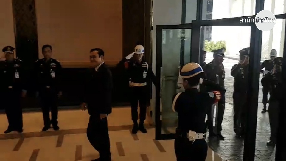 นายกรัฐมนตรี ตอบคำถามผู้สื่อข่าวสั้น ๆ ด้วยสีหน้าที่ยิ้มแย้มถึงกรณีการปรับคณะรัฐมนตรี ประยุทธ์ 5 ว่า ยังไม่ได้นำรายชื่อขึ้นทูลเกล้าฯ และฝากดูแลประเทศด้วย.-สำนักข่าวไทย