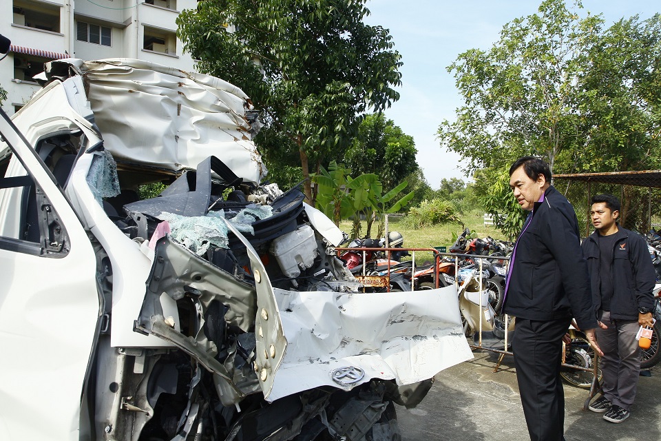 วันนี้ (10 พ.ย.) ที่ สภ.บางปะอิน จ.พระนครศรีอยุธยา นายกมล บูรณพงศ์ รองอธิบดีกรมการขนส่งทางบก ประชุมร่วมกับ พ.ต.อ.สง่า ธีรศรัณยานนท์ รองผู้บังคับการตำรวจภูธรจังหวัดพระนครศรีอยุธยา ตัวแทนจากสำนักงานคณะกรรมการกำกับและส่งเสริมการประกอบธุรกิจประกันภัย และนายมานิตย์ ศรีทอง ทนายความจากบริษัทรถตู้ เพื่อหารือกรณีอุบัติเหตุรถตู้บริการนักท่องเที่ยวชนท้ายรถบรรทุกสิบล้อบนถนนสาย 347 เขตบางปะอิน เมื่อเย็นวันที่ 8 พ.ย.ที่ผ่านมา เสียชีวิต 5 ราย ในจำนวนนี้เป็นนักท่องเที่ยวชาวญี่ปุ่น 4 ราย และไกด์ชาวไทย 1 ราย ส่วนคนขับอาการสาหัสอยู่โรงพยาบาลพระนครศรีอยุธยา จากนั้นนายกมล และผู้เกี่ยวข้องได้ตรวจสอบสภาพรถตู้ที่เคลื่อนย้ายมาไว้ด้านหลังโรงพัก