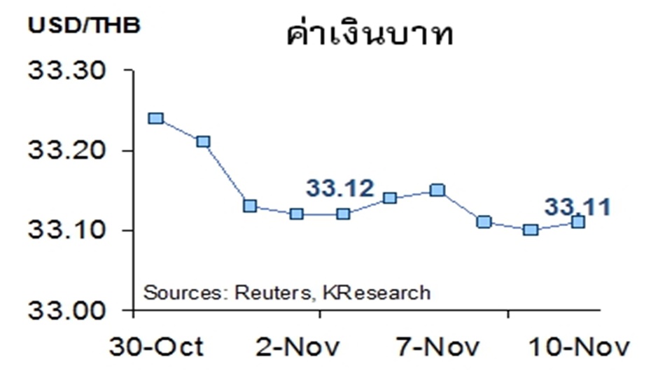 บริษัท ศูนย์วิจัยกสิกรไทยรายงานการเคลื่อนไหวของเงินบาทสัปดาห์ที่ผ่านมา (6-10 พ.ย.) ว่า ใกล้เคียงระดับ 33.10 บาทต่อดอลลาร์สหรัฐ โดยเงินบาททยอยแข็งค่าขึ้นเล็กน้อยตั้งแต่กลางสัปดาห์ท่ามกลางปัจจัยลบของเงินดอลลาร์ฯ โดยเฉพาะจากความไม่แน่นอนของแผนปฏิรูปภาษีของสหรัฐ หลังจากร่างกฎหมายของวุฒิสมาชิกเสนอให้เลื่อนเวลาการปรับลดอัตราภาษีนิติบุคคลลงสู่ร้อยละ 20 ออกไปจนถึงปี 2562 นอกจากนี้ เงินดอลลาร์ฯ ยังมีปัจจัยกดดันจากความกังวลเกี่ยวกับสัญญาณการดำเนินนโยบายการเงินของธนาคารกลางสหรัฐ (เฟด) ปีหน้า ซึ่งจะมีคณะกรรมการ FOMC ปรับเปลี่ยนหลายตำแหน่ง สำหรับวันศุกร์ที่ 10 พฤศจิกายน เงินบาทอยู่ที่ 33.11 บาทต่อดอลลาร์ฯ เทียบกับระดับ 33.12 บาทต่อดอลลาร์ฯ ในวันศุกร์ก่อนหน้า