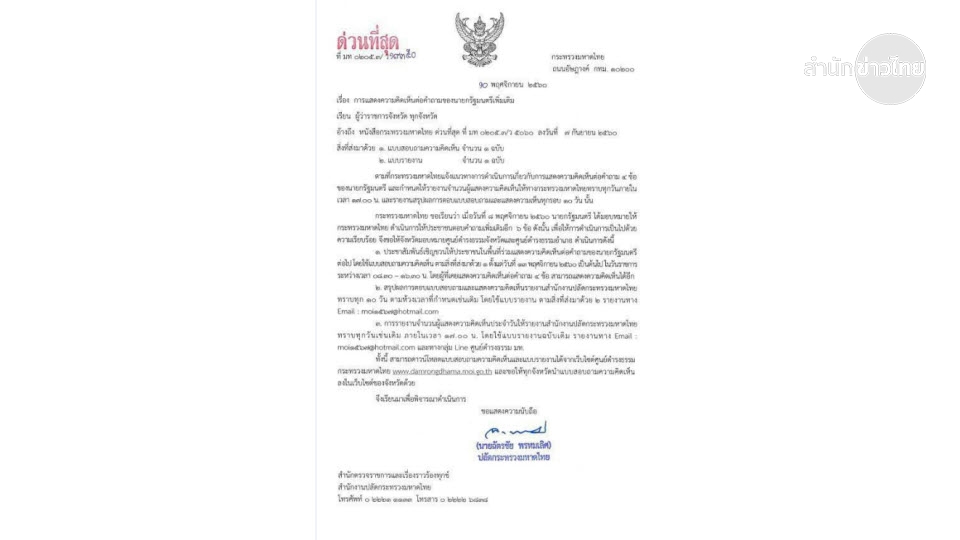 มหาดไทย 11 พ.ย. – ปลัด มท.มีหนังสือด่วนที่สุดถึงผู้ว่าฯ ทั่วประเทศ ให้เชิญชวนประชาชนตอบคำถาม 6 ข้อของนายกฯ ตั้งแต่ 13 พ.ย.นี้ พร้อมรายงานจำนวนผู้มาแสดงความคิดเห็นให้ทราบทุกวัน