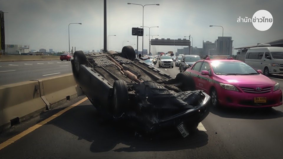 กรุงเทพฯ 14 พ.ย. – รถชนกันสนั่นโทลล์เวย์ พลิกหงายท้องล้อชี้ฟ้า-ท้ายพังยับ ตำรวจจราจรเร่งช่วยเหลือ พร้อมเปิดการจราจร