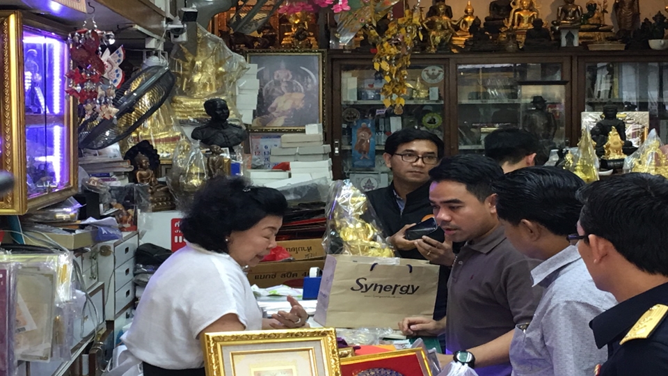 ร้านแรก ชื่อร้านเงินทอง มีนางทัศนีย์ หอจรัสกุล อายุ 65 ปี เป็นเจ้าของ ใกล้ตรอกนครท่าพระจันทร์ โดยทำการล่อซื้อ จำนวน 100 เข็ม เป็นเงิน 6,000 บาท สอบสวนอ้างว่ารู้ว่าเป็นเข็มปลอม แต่ทำเลียนแบบได้เหมือนมาก มีคนรู้จักจาก จ.ราชบุรี มาฝากขายเมื่อเช้านี้ จึงรับไว้ ในราคาขายส่งเข็มละ 60 บาท และขายปลีกเข็มละ 120 บาท ส่วนอีก 2 ร้าน ไม่พบว่ามีการจำหน่ายเข็มที่ระลึก ปลอม