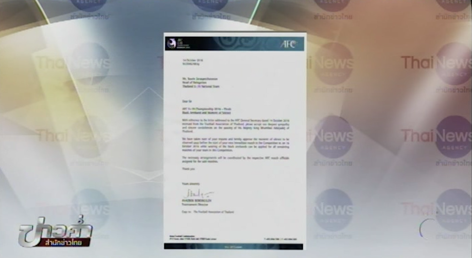 สมาพันธ์ฟุตบอลเอเชีย หรือ เอเอฟซี ตอบรับคำขอของทีมชาติไทย ที่จะสวมปลอกแขนสีดำ พร้อมยืนสงบนิ่งเกมชิงแชมป์เอเชีย รุ่นอายุไม่เกิน 19ปี เนื่องจากอยู่ในช่วงพระราชพิธี พระบรมศพ พระบาทสมเด็จพระเจ้าอยู่หัว ในพระบรมโกศ ตลอดการแข่งขันที่ ซึ่งก่อนหน้านี้ทางสมาคมกีฬาฟุตบอลแห่งประเทศไทย ทำจดหมายที่ส่งถึงเลขาธิการทั่วไปเอเอฟซี ลงวันที่ 14 ตุลาคม 2016 เพื่อยื่นคำร้องไปทางเลขาธิการทั่วไปของเอเอฟซี เพื่อขออนุญาต ยืนสงบนิ่งและสวมปลอกแขนสีดำ ในเกมที่ทีมชาติไทยลงทำการแข่งขันตลอดทัวร์นาเมนต์ที่เหลือ ซึ่งทางเอเอฟซีก็ตอบรับกลับมาด้วยดี