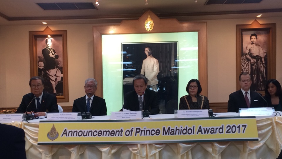 นายแพทย์ประสิทธิ์ วัฒนาภา คณบดีคณะแพทยศาสตร์ศิริราชพยาบาลศาสตราจารย์นายแพทย์วิจารณ์ พานิช ประธานคณะกรรมการรางวัลนานาชาติมูลนิธิรางวัลสมเด็จเจ้าฟ้ามหิดล นายกลิน ที เดวี่ส์เอกอัครราชทูตสหรัฐอเมริกาประจำประเทศไทย ร่วมกันประกาศผลการตัดสินผู้ได้รับพระราชทานรางวัลสมเด็จเจ้าฟ้ามหิดลประจำปี 2560