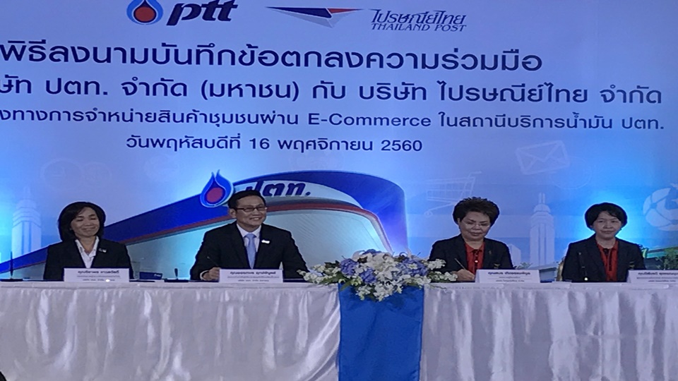นายอรรถพล ฤกษ์พิบูลย์ ประธานเจ้าหน้าที่ปฏิบัติการกลุ่มธุรกิจปิโตรเลียมขั้นปลาย บริษัท ปตท. จำกัด (มหาชน) กล่าวว่า ขณะนี้มีการจัดตั้งเคาน์เตอร์ให้บริการไปรษณีย์ไทยในสถานีน้ำมันของ ปตท. 6 แห่ง เพื่อเป็นจุดรวบรวมและกระจายสินค้าชุมชนสินค้าจากโครงการไปรษณีย์เพิ่มสุข สินค้า OTOP และ SMEs รวมถึงผักและผลไม้ตามฤดูกาลที่จะสลับหมุนเวียนมาจำหน่ายให้ผู้ใช้บริการสถานีน้ำมัน ปตท.และผู้ใช้บริการไปรษณีย์ไทยร่วมกันอุดหนุนสินค้าจากผู้ผลิตหรือเกษตรกร รวมถึงการสั่งซื้อผ่านช่องทางออนไลน์ www.thailandpostmart.com ที่จะสามารถเลือกมารับสินค้าได้ ณ เคาน์เตอร์บริการไปรษณีย์ในสถานีบริการน้ำมันของ ปตท. ในอนาคตก็จะศึกษาร่วมกันในการขยายขอบข่ายการทำงานที่เพิ่มขึ้น