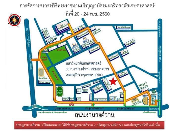 วันนี้ (18 พ.ย.60) พล.ต.ต.จิรพัฒน์ ภูมิจิตร รองผู้บัญชาการตำรวจนครบาล และ พล.ต.ต. ธีรศักดิ์ สุริวงศ์ รักษาราชการแทน ผู้บังคับการจราจร ขอประชาสัมพันธ์ข่าวสารกิจกรรมที่อาจมีผลกระทบต่อการจราจรดังนี้ มหาวิทยาลัยเกษตรศาสตร์(มก.)จะมีพิธีพระราชทานปริญญาบัตรแก่บัณฑิตผู้สำเร็จการศึกษาประจำปีการศึกษา 2559 ระหว่าง วันที่ 20-24 พฤศจิกายน 2560 นี้ ซึ่งครั้งนี้จะมีบัณฑิตเข้าร่วมพิธีพระราชทานปริญญาบัตรทั้งสิ้น 15,077 คน หรือประมาณวันละ 3,000 คน