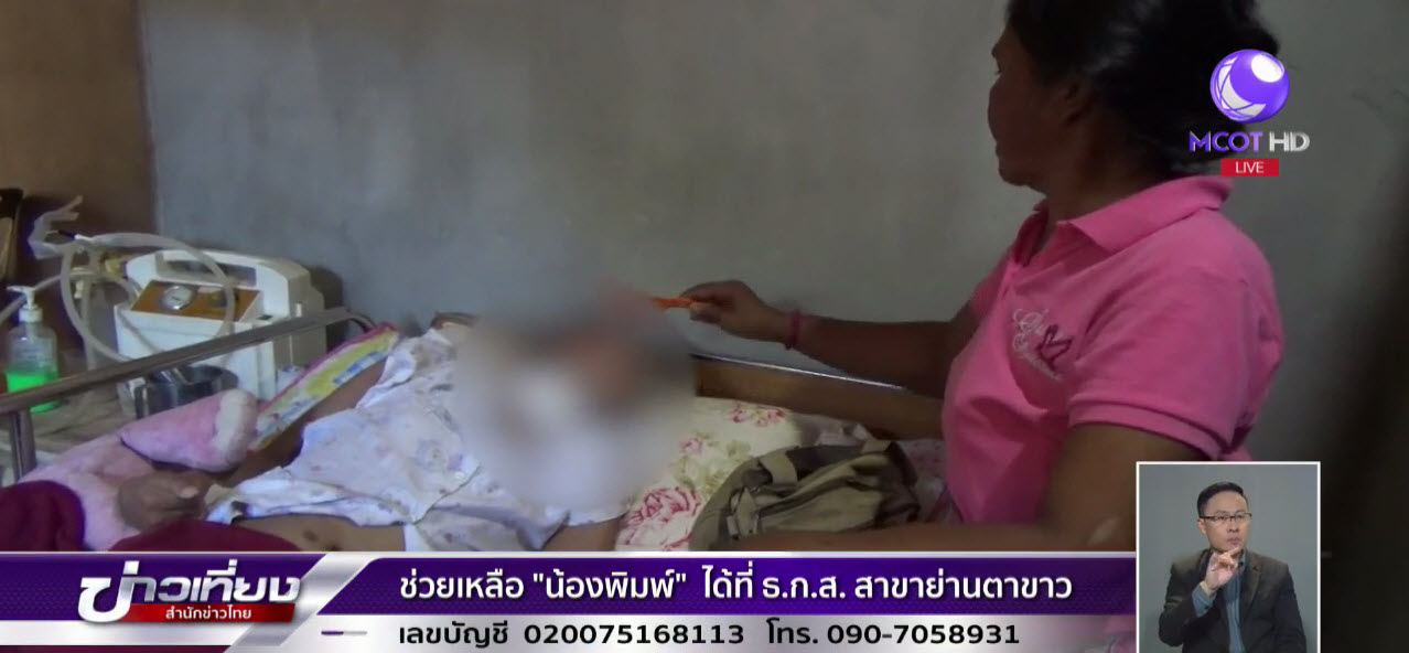 น.ส.สมใจ ทองขวิด นางวิรัตน์ ทองขวิด แม่และยายกำลังช่วยกันป้อนอาหารทางสายยางให้กับ ด.ญ.ธิดารักษ์ รองรักษ์ หรือ น้องพิมพ์ วัย 12 ปี ที่อาศัยอยู่ในบ้านพักเลขที่ 98 หมู่ 2 ต.โพรงจระเข้ อ.ย่านตาขาว จ.ตรัง หลังจากเมื่อ 2 ปีก่อน น้องพิมพ์กินบะหมี่กึ่งสำเร็จรูป แต่เส้นหลุดเข้าหลอดลม เกิดอาการชักเกร็ง ปัสสาวะเรี่ยราดหมดสติ จึงนำตัวส่งโรงพยาบาลย่านตาขาว แต่เนื่องจากอาการวิกฤติ ทำให้ต้องส่งต่อไปยังโรงพยาบาลตรัง ระยะทางไกลกว่า 40 กิโลเมตร แพทย์ดูดเอาเส้นบะหมี่ออกจากหลอดลม ก่อนจะช่วยปั๊มหัวใจด้วยการช็อตไฟฟ้าจนมีสัญญาณชีพกลับมา แต่ต้องกลายเป็นผู้ป่วยติดเตียงนอนรักษาตัวอยู่ที่โรงพยาบาลตรังนานกว่า 2 เดือน แต่อาการไม่ดีขึ้น ยังต้องเข้า-ออกโรงพยาบาลหลายครั้ง แพทย์ระบุว่าเกิดจากภาวะขาดเกลือแร่ ขาดน้ำ และมีโซเดียมในร่างกายสูงมาก ไตทำงานหนักจนปัสสาวะไหลออกมาเป็นสีเหลืองข้น เพราะขาดออกซิเจนนานเกินไป