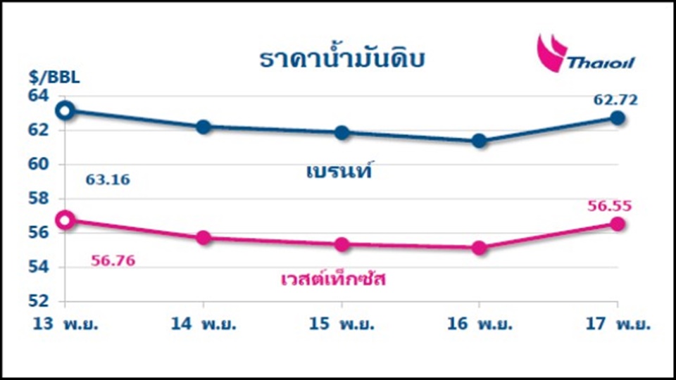 บมจ.ไทยออยล์คาดราคาน้ำมันดิบเวสต์เท็กซัสสัปดาห์นี้ (20-24 พ.ย.) จะเคลื่อนไหวที่กรอบ 53-58 เหรียญสหรัฐต่อบาร์เรล ส่วนน้ำมันดิบเบรนท์เคลื่อนไหวที่กรอบ 60-65 เหรียญสหรัฐต่อบาร์เรล โดยสัปดาห์นี้มีแนวโน้มทรงตัวระดับสูง เนื่องจากได้รับแรงหนุนจากข่าวการขยายระยะเวลาการปรับลดกำลังการผลิตของผู้ผลิตทั้งในและนอกกลุ่มโอเปกก่อนการประชุมวันที่ 30 พฤศจิกายนนี้ ประกอบกับสถานการณ์ความไม่สงบในตะวันออกกลางระหว่างซาอุดิอาระเบียและอิหร่าน ที่มีแนวโน้มทวีความรุนแรง ซึ่งสร้างความกังวลต่อตลาดว่าอุปทานน้ำมันดิบจะตึงตัวมากขึ้น