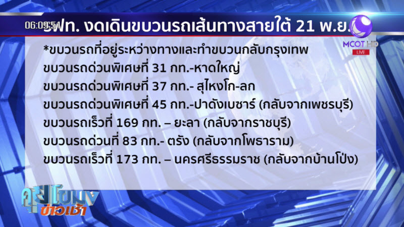 ทั้งนี้ จะมีขบวนรถที่งดเดินในเส้นทางสายใต้ วันนี้ (22 พ.ย.) คือ ขบวนรถเร็วที่ 168 และขบวนรถด่วนที่ 86, 40, 42 ซึ่งผู้โดยสารสามารถสอบถามข้อมูลเพิ่มเติมได้ที่ Call Center 1690. – สำนักข่าวไทย