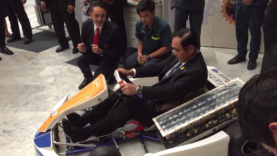 ทำเนียบฯ 22 พ.ย. – นายกฯ โชว์ขับยานยนต์ไฟฟ้าต้นแบบของนักเรียนอาชีวะ วิทยาลัยเทคนิคสัตหีบ หนึ่งในการพัฒนาการศึกษาในการพัฒนาระเบียงเศรษฐกิจพิเศษภาคตะวันออก ย้ำรัฐบาลนี้ต้องการพัฒนาการศึกษาเพื่อเด็กรุ่นใหม่ ทุกอย่างทำไว้ให้ นำไปขยายและทำให้เกิดความเชื่อมโยงในพื้นที่ สั่งการ ศธ.บรรจุหลักสูตรเกี่ยวกับวิทยาศาสตร์และการจัดทำหุ่นยนต์ ให้นักเรียนเป็นทางเลือกเรียนรู้
