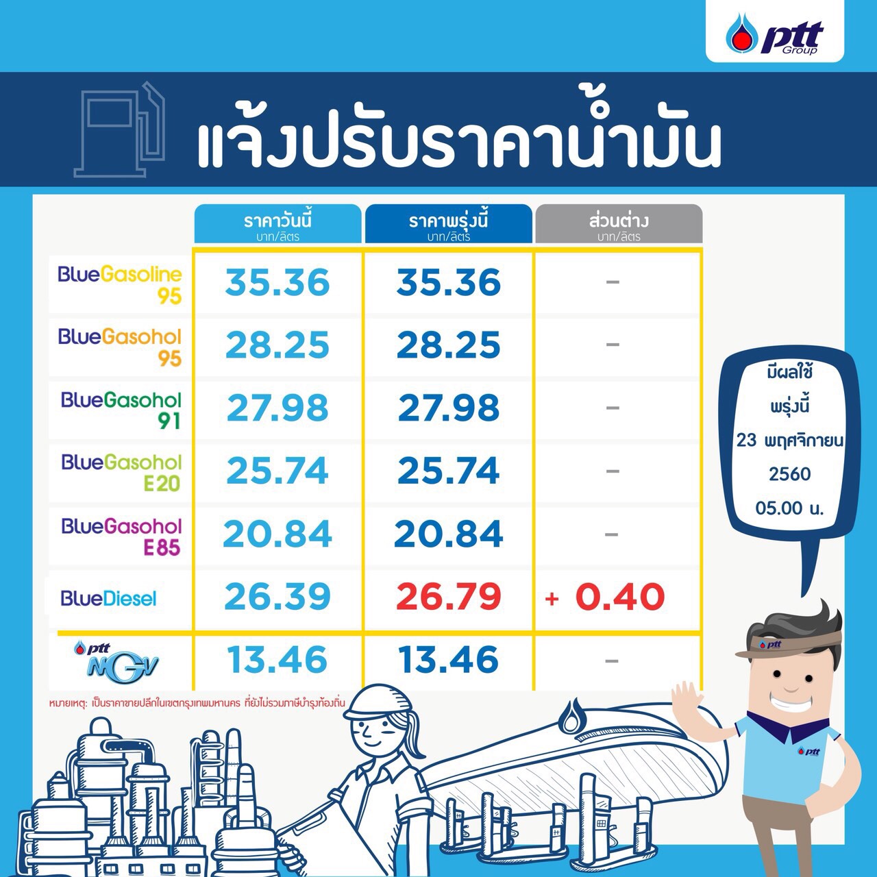 บมจ.ปตท.และบางจากฯ ประกาศปรับราคาขายปลีกน้ำมันดีเซล เพิ่มขึ้น 40 สตางค์ต่อลิตร ส่วนเบนซินและแก๊สโซฮอล์คงเดิม มีผลวันที่ 23 พฤศจิกายน 2560 เวลา 05.00 น. เป็นต้นไป โดยราคาขายปลีกจะเป็นดังนี้ เบนซิน 95 อยู่ที่ 35.36 บาท แก๊สโซฮอล์ 95 อยู่ที่ 28.25 บาท แก๊สโซฮอล์ 91 อยู่ที่ 27.98 บาท E20 อยู่ที่ 25.74 บาท E85 อยู่ที่ 20.84 บาท และดีเซล 26.79 บาทต่อลิตร โดยราคาขายปลีกข้างต้นยังไม่รวมภาษีบำรุงกรุงเทพมหานคร.-สำนักข่าวไทย