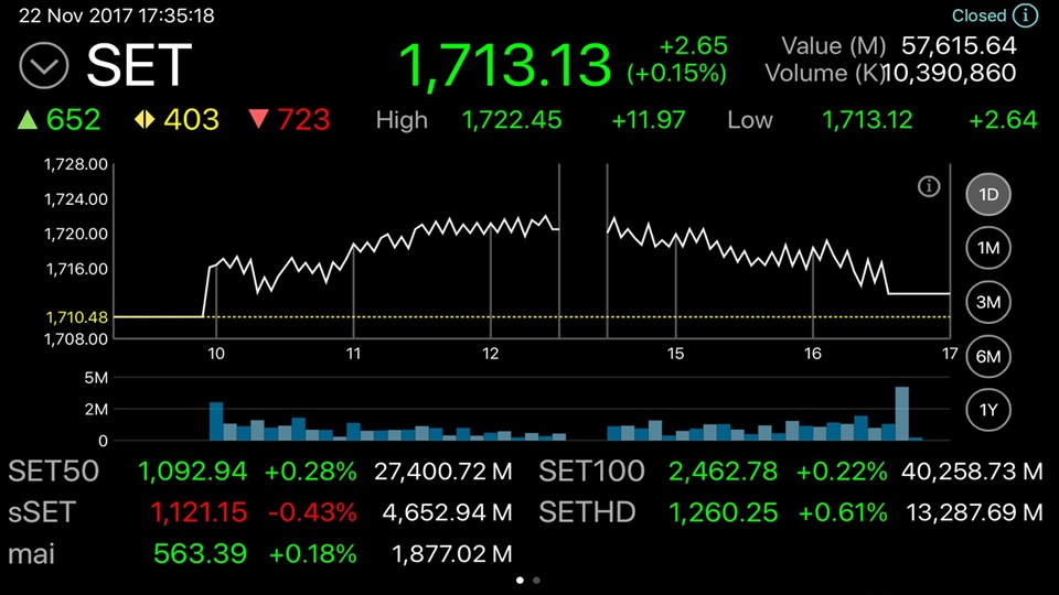 ผู้สื่อข่าวรายงานว่าดัชนีตลาดหลักทรัพย์ปิดที่ระดับ 1,713.13 จุด เพิ่มขึ้น 2.65 จุด (+0.15%) มูลค่าการซื้อขาย 57,615.64 ล้านบาท การซื้อขายหุ้นวันนี้ดัชนีเคลื่อนไหวแดนบวกตลอดทั้งวัน โดยดัชนีฯ แตะจุดสูงสุดที่ 1,722.45 จุด และต่ำสุดที่ระดับ 1,713.12 จุด