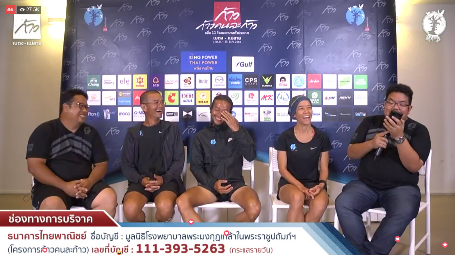 สำนักข่าวไทย 22 พ.ย.-“ตูน บอดี้สแลม” พร้อมทีมงานก้าวคนละก้าว รวมทั้งตัวแทนศิลปิน ร่วมพูดคุยผ่าน Live เพจ #ก้าว หลังแจ้งหยุดวิ่ง 2 วัน 23-24 พ.ย.60 เนื่องจาก “ตูน” มีอาการบาดเจ็บ โดยจะกลับมาวิ่งอีกครั้งเช้าวันที่ 25 พ.ย.นี้ เวลา 04.00 น. ส่วน 2 วันที่ไม่ได้วิ่งยังคงมีการ Live ผ่านเพจก้าว ให้แฟนๆ ได้ติดตามข้อมูลกันตลอด