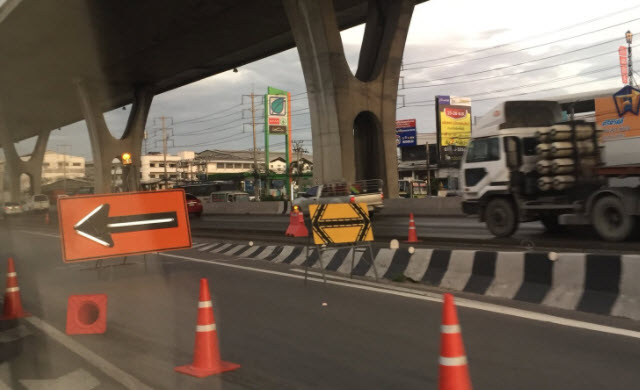 ถนนเทพรัตน (บางนาตราด) ขาเข้าที่ กม.16 เจ้าหน้าที่ปิดช่องทางเบี่ยงจากคู่ขนานไปช่องทางด่วน เพราะมีการขูดผิวการจราจรเอาไว้ การจราจรติดขัด