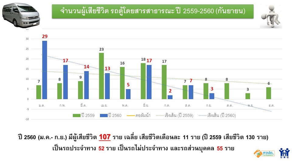 ด้านนพ.ธนะพงศ์ จินวงษ์ ผู้จัดการศูนย์วิชาการเพื่อความปลอดภัยทางถนน (ศวปถ.) เปิดเผยว่า หากมองเจาะกลุ่มรถตู้ สถิติ ปี 60 ตั้งแต่เดือน ม.ค.-ก.ย. รถตู้โดยสารสาธารณะ เกิดอุบัติเหตุ 217 ครั้ง เฉลี่ยเดือนละ 24 ครั้ง แบ่งเป็น รถตู้ไม่ประจำทาง(ทะเบียน 30 )เกิดอุบัติเหตุ 56 ครั้ง มีผู้เสียชีวิต 25 บาดเจ็บ 251 รายเฉลี่ยเดือนละ 6 ครั้ง สาเหตุเกิดจากคนขับหลับในและขับเร็วเอง 20 ครั้ง จากสภาพรถ 28 ครั้ง(ยางแตก ไฟไหม้) อื่นๆ เช่น ถนนลื่น 8 ครััง รถประจำทาง เกิด 57 ครั้ง เสียชีวิต 44 บาดเจ็บ 204 ราย และรถตู้ส่วนบุคคล 104 ครั้ง ซึ่งทั้งหมดต่างสะท้อนว่า ควรเริ่มแก้ปัญหาอย่างจริงจังและสิ่งที่ดำเนินการได้ทันที คือการวางหลักเกณฑ์และระบบติดตามกำกับทั้งในส่วนมาตรฐานคนขับ โครงสร้างรถยนต์และระบบประกันภัย อีกทั้งตำรวจท่องเที่ยวสามารถเข้ามามีบทบาทสอบสวนเชิงระบบเพื่อยกระดับความปลอดภัยให้มีมาตราฐาน.-สำนักข่าวไทย