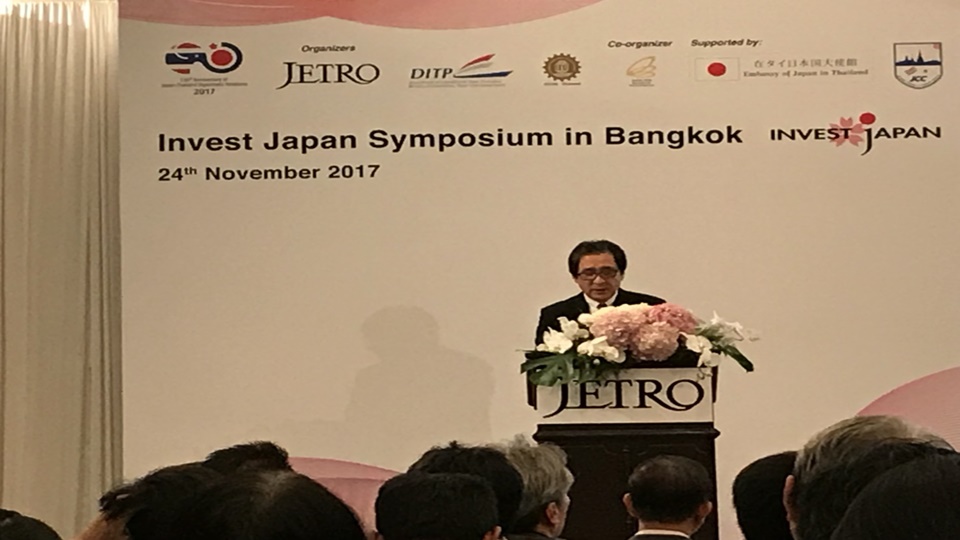 นายฮิโรยูกิ อิชิเกะ ประธานคณะกรรมการบริหารเจโทรสำนักงานใหญ่ ประเทศญี่ปุ่น กล่าวในงานสัมมนา “Invest Japan Symposium 2017” ว่า ประเทศญี่ปุ่นพร้อมรับการลงทุนจากผู้ประกอบการไทย โดยปีที่ผ่านมาไทยลงทุนในญี่ปุ่นมูลค่ากว่า 659 ล้านดอลลาร์สหรัฐ เป็นผู้ลงทุนอันดับ 11 ในญี่ปุ่น โดยผู้ประกอบการญี่ปุ่นขณะนี้เริ่มตระหนักและรู้ถึงนโยบายของไทย ทั้งประเทศไทย 4.0 รวมถึงโครงการระเบียงเศรษฐกิจภาคตะวันออก (อีอีซี) มากขึ้น และให้ความสนใจที่จะเข้ามาลงทุน ขณะเดียวกันการเปลี่ยนโครงสร้างทางเศรษฐกิจของไทยเน้นการลงทุนโดยตรงในต่างประเทศสูงขึ้นและมากกว่าการลงทุนภายในประเทศ