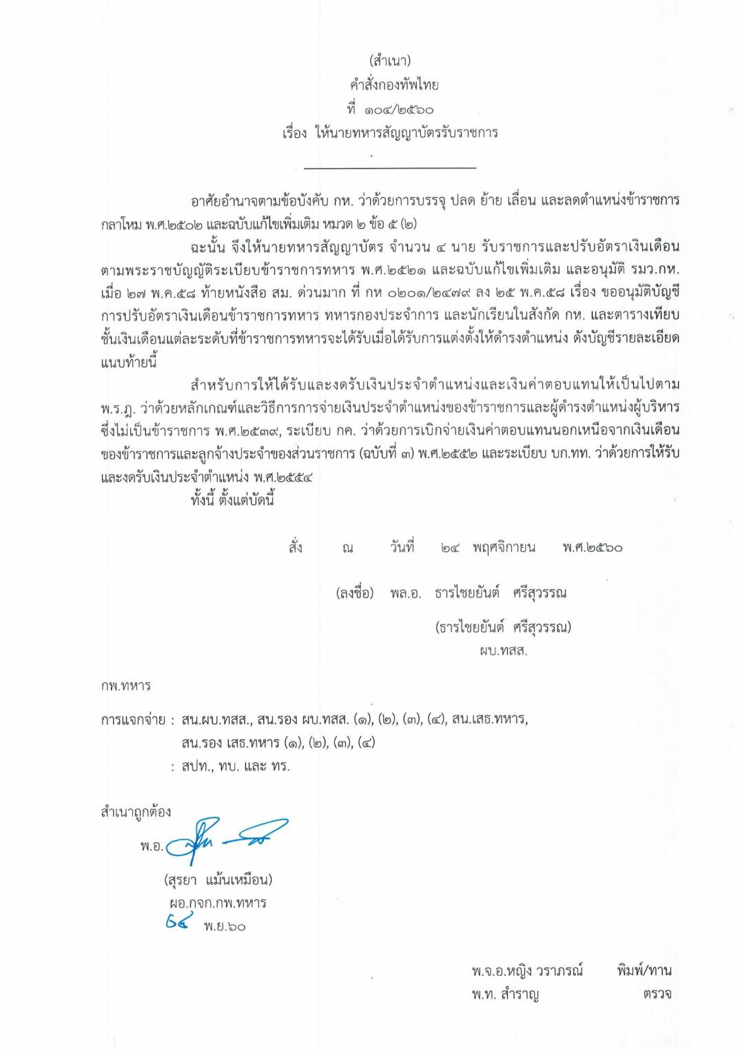สำหรับรายละเอียดคำสั่งที่ 104/2530 เรื่องให้นายทหารสัญญาบัตรรับราชการ ระบุว่า อาศัยอำนาจตามข้อบังคับกระทรวงกลาโหม ว่าด้วยการบรรจุ ปลด ย้าย เลื่อน และลดตำแหน่งข้าราชการกลาโหม พุทธศักราช 2502 และฉบับแก้ไขเพิ่มเติม หมวด 2 ข้อ 5 (2) ฉะนั้น จึงให้นายทหารสัญญาบัตร จำนวน 4 นาย รับราชการและปรับอัตราเงินเดือน ตามพระราชบัญญัติระเบียบข้าราชการทหาร พุทธศักราช 2521และฉบับแก้ไขเพิ่มเติม และอนุมัติ รัฐมนตรีว่าการกระทรวงกลาโหม เมื่อ 27 พฤษภาคม 2558 ท้ายหนังสือ สม.ด่วนมาก ที่กห.0201/2479 ลง 25 พฤษภาคม 2558เรื่อง ขออนุมัติบัญชีการปรับอัตราเงินเดือนข้าราชการทหาร ทหารกองประจำการ และนักเรียนในสังกัด กลาโหม และตารางเทียบขั้นเงินเดือน แต่ละระดับ ที่ข้าราชการทหารจะได้รับการแต่งตั้งให้ดำรงตำแหน่ง ทั้งนี้การให้ได้รับ และงดรับเงินประจำตำแหน่งและเงินค่าตอบแทนให้เป็นไปตามพระราชกฤษฎีกา ว่าด้วยหลักเกณฑ์และวิธีการจ่ายเงินประจำตำแหน่งของข้าราชการและผู้ดำรงตำแหน่งผู้บริหาร ซึ่งไม่เป็นข้าราชการ พุทธศักราช 2539 ระเบียบ กค.ว่าด้วยการเบิกจ่ายค่าตอบแทนนอกเหนือจากเงินเดือนของข้าราชการและลูกจ้างประจำของส่วนราชการ (ฉบับที่3) พ.ศ.2552 และระเบียบ บก.ทท.ว่าด้วยการให้รับและงดรับเงินเดือนประจำตำแหน่ง พ.ศ.2554 ลงคำสั่ง ณ วันที่ 24 พฤศจิกายน 2560 โดยพลเอกธารไชยยันต์ ศรีสุวรรณ ผู้บัญชาการทหารสูงสุด.-สำนักข่าวไทย