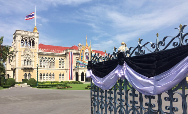 ทำเนียบฯ 14 ต.ค. – ทำเนียบฯ ประดับผ้าแสดงความอาลัย ขณะที่นายกรัฐมนตรีงดภารกิจ เพื่อเข้าร่วมในการเชิญพระบรมศพฯ
