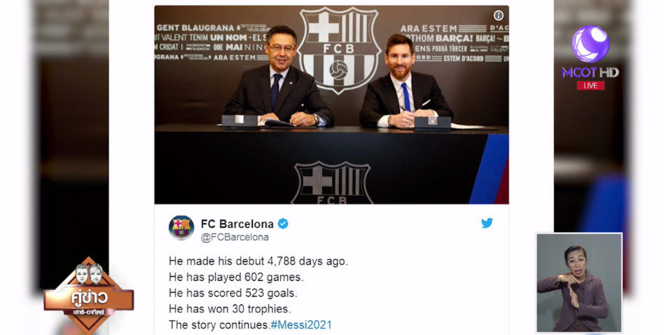 26 พ.ย. – ทวิตเตอร์ของสโมสร บาร์เซโลน่า ได้ออกมาประกาศอย่างเป็นทางการว่า พวกเขานั้นได้ทำการเซ็นสัญญาฉบับใหม่กับสตาร์ประจำทีมอย่าง ลีโอเนล แมสซี่ โดยการเซ็นสัญญาครั้งนี้ มีการระบุว่า ค่าเหนื่อยของแมสซี่ คาดว่าจะสูงถึงสัปดาห์ละ 670,000 ปอนด์ หรือประมาณ 30 ล้านบาท โดยมีการพ่วงค่าฉีกสัญญาไว้ถึง 700 ล้านยูโร (ประมาณ 27,000 ล้านบาท) ด้วยสัญญา 5 ปี ด้วยกัน ก่อนหน้านี้ กองหน้าทีมชาติอาร์เจนติน่า สัญญาจะสิ้นสุดลงในวันที่ 30 มิถุนายน ปี 2018 เเละ มีค่าฉีกสัญญา 250 ล้านยูโร เเละ มีข่าวมากมายว่า ตัวเขานั้นต้องการจะย้ายออกจากสโมสร เนื่องจากไม่พอใจ บอร์ดบริหารเรื่องการขาย เนย์มาร์ ดาวยิงทีมชาติบาร์ซิล ออกจากสโมสรไป