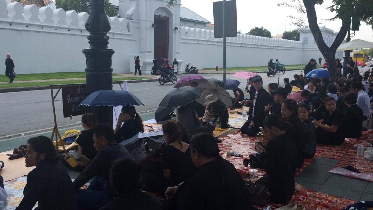 บรรยากาศบริเวณริมถนนมหาราช หน้าราชนาวีสโมสร ซึ่งตั้งอยู่ตรงข้ามกับพระบรมมหาราชวัง มีประชาชนจำนวนมาก พร้อมใจกันใส่ชุดสีดำ ทยอยมาจับจองพื้นที่ เพื่อรอร่วมถวายความอาลัยในพระราชพิธีเคลื่อนพระบรมศพพระบาทสมเด็จพระเจ้าอยู่หัวในพระบรมโกศ จากโรงพยาบาลศิริราช มายังพระบรมมหาราชวัง ประชาชนที่มาเฝ้ารอมาจากทั่วทุกสารทิศ ต่างบอกว่าตั้งใจมาเฝ้ารอส่งเสด็จในหลวงโดยมาตั้งแต่เช้ามืด หลังทราบข่าวว่าจะมีการเคลื่อนพระบรมศพผ่านเส้นนี้จึงรีบมาจับจองที่นั่ง โดยจะขอน้อมนำแนวพระราชดำริทมาเป็นแนวทางในการดำเนินชีวิต โดยเฉพาะความพอเพียงและความสามัคคี