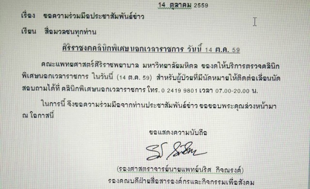 รพ.ศิริราช 14 ต.ค.-ศิริราช แจ้งงดคลินิกพิเศษนอกเวลาราชการวันนี้