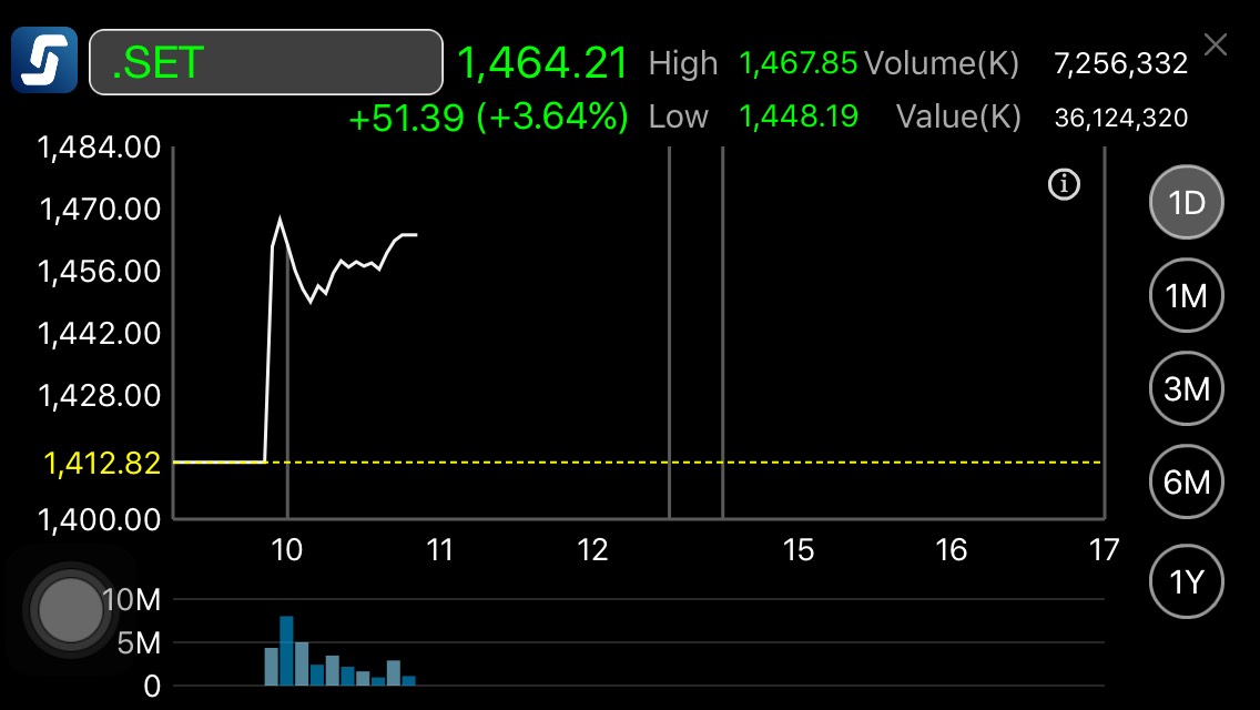 ดัชนีหุ้นไทยเปิดทำการซื้อขาย ปรับตัวขึ้น 48 จุด โดยมีแรงซื้อในหุ้นขนาดใหญ่ จากที่ก่อนหน้านี้ราคาร่วงลงไปแรง โดยดัชนีปรับขึ้นไปเกือบร้อยละ 5