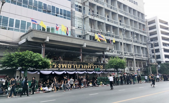 รพ.ศิริราช 14 ต.ค. -รพ.ศิริราช ตรวจคัดกรองบุคคลที่เข้าออกภายใน รพ. ต้องมีใบนัดหรือผู้ป่วยฉุกเฉิน ขณะที่ประชาชนจับจองพื้นที่เนืองแน่น เพื่อรอร่วมไว้อาลัยในพิธีเคลื่อนพระบรมศพพระบาทสมเด็จพระเจ้าอยู่หัวในพระบรมโกศ