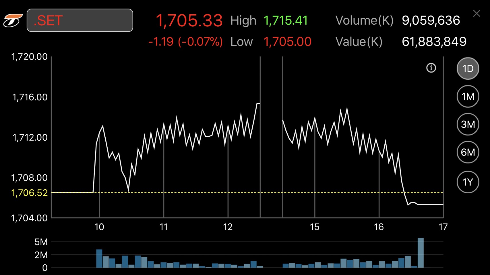 ผู้สื่อข่าวรายงานว่าดัชนีตลาดหลักทรัพย์ปิดที่ระดับ 1,705.33 จุด ลดลง 1.19 จุด หรือร้อยละ0.07 มูลค่าการซื้อขาย 61,883.85 ล้านบาท การซื้อขายหุ้นวันนี้ (29 พ.ย.) ดัชนีหุ้นไทยเคลื่อนไหวแดนบวกเป็นส่วนใหญ่ จนมาปิดตลาดได้พลิกเป็นติดลบ โดยดัชนีฯ แตะจุดสูงสุดที่ 1,715.41 จุด และแตะจุดต่ำสุดที่ระดับ 1,705.00 จุด