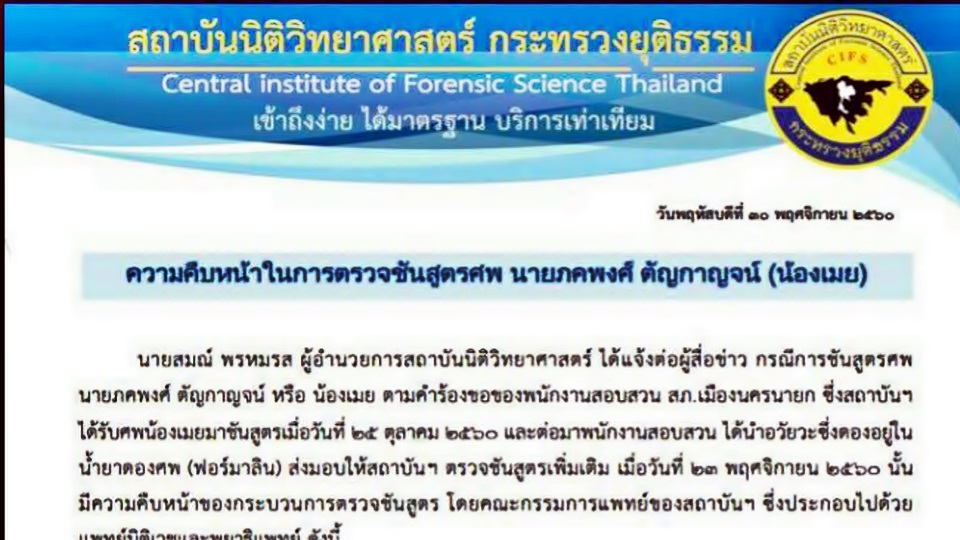 ยธ.30พ.ย.-สถาบันนิติวิทยาศาสตร์ ยังไม่สรุปผลชันสูตรศพ ‘น้องเมย’ รอตรวจพิสูจน์อวัยวะภายใน ขอเวลาเจ้าหน้าที่ทำงานอย่างละเอียดรอบคอบตามมาตรฐาน