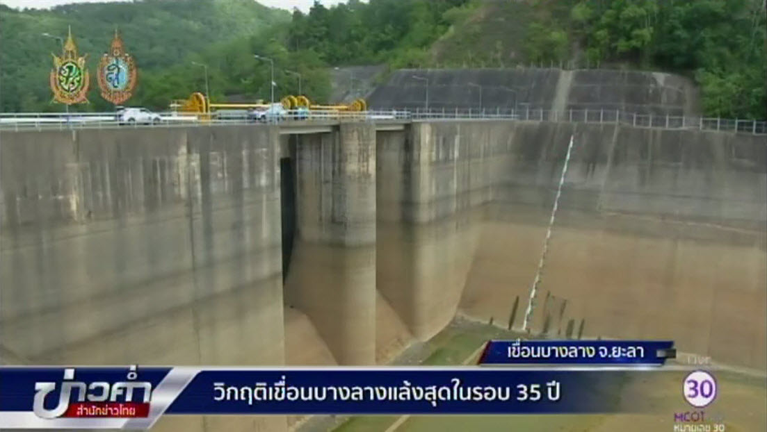 ระดับน้ำที่ลดลงต่ำสุดจนเผยให้เห็นบางส่วนของพื้นอ่างเก็บน้ำ แห้งแล้งแตกระแหง สะท้อนให้เห็นถึงความแล้งจัดของภาคใต้ในปีนี้ ระดับน้ำในเขื่อนบางลางลดลงต่ำสุดนับตั้งแต่สร้างเขื่อนมา 35 ปี ระดับน้ำอยู่ที่ 87.94 เมตรเหนือระดับน้ำทะเลปานกลาง ยังคงเหลือน้ำไว้ใช้อีกร้อยละ 9 หรือปริมาณ 110.6 ล้านลูกบาศก์เมตร แต่จำเป็นต้องระบายน้ำออกทุกวัน วันละ 2 ล้านลูกบาศก์เมตร เพื่อใช้ในการชลประทาน รักษาระบบนิเวศ และเพื่อการอุปโภคบริโภคของประชาชนใน จ.ยะลา และ จ.ปัตตานี