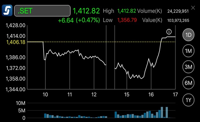 ตลท. 13 ต.ค. – ผู้สื่อข่าวรายงานว่า ดัชนีหุ้นไทยปิดการซื้อขายวันนี้ที่ระดับ 1,412.82 จุด เพิ่มขึ้น 6.64 จุด หรือร้อยละ 0.47 มูลค่าการซื้อขาย 103,973.27 ล้านบาท การซื้อขายหุ้นวันนี้ผันผวนอย่างหนัก ดัชนีเคลื่อนไหวแดนลบเป็นส่วนใหญ่ โดยเฉพาะภาคบ่ายร่วงลงไปต่ำสุดเกือบ 50 จุด ต่ำสุดของวันอยู่ที่ 1,356.79 จุด ก่อนที่ช่วงท้ายตลาดฯ จะพลิกกลับเป็นบวก เนื่องจากทางเทคนิคมีสัญญาณซื้อเข้ามา