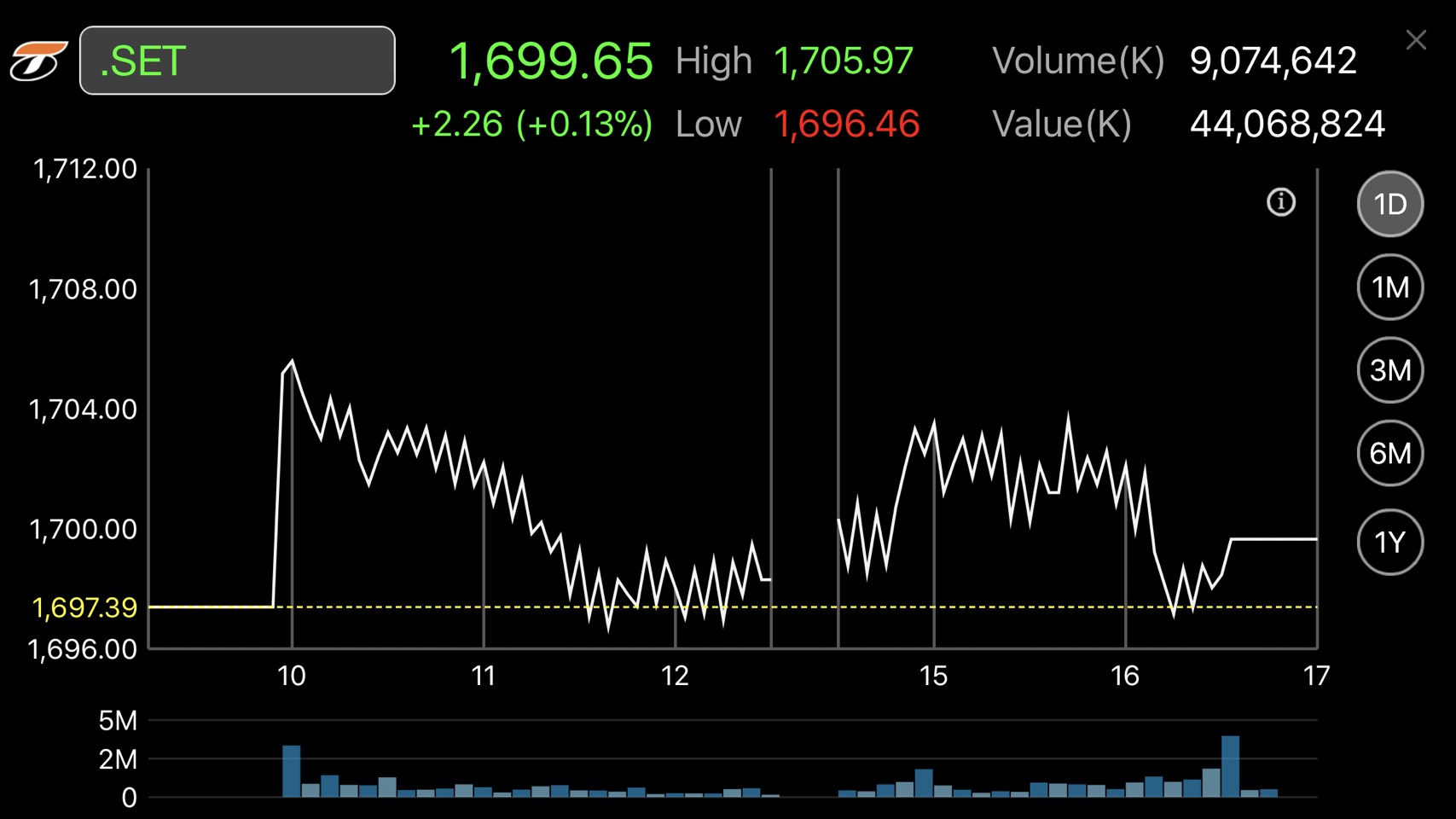 ผู้สื่อข่าวรายงานว่าดัชนีตลาดหลักทรัพย์ปิดการซื้อขายวันนี้ (1 ธ.ค.) ที่ระดับ 1,699.65 จุด เพิ่มขึ้น 2.26 จุด หรือร้อยละ 0.13 มูลค่าการซื้อขาย 44,068.82 ล้านบาท ดัชนีเคลื่อนไหวแกว่งตัวทั้งแดนบวกและลบ โดยสูงสุดของวันที่ระดับ 1,705.97 จุด และต่ำสุดที่ 1,696.46 ล้านบาท