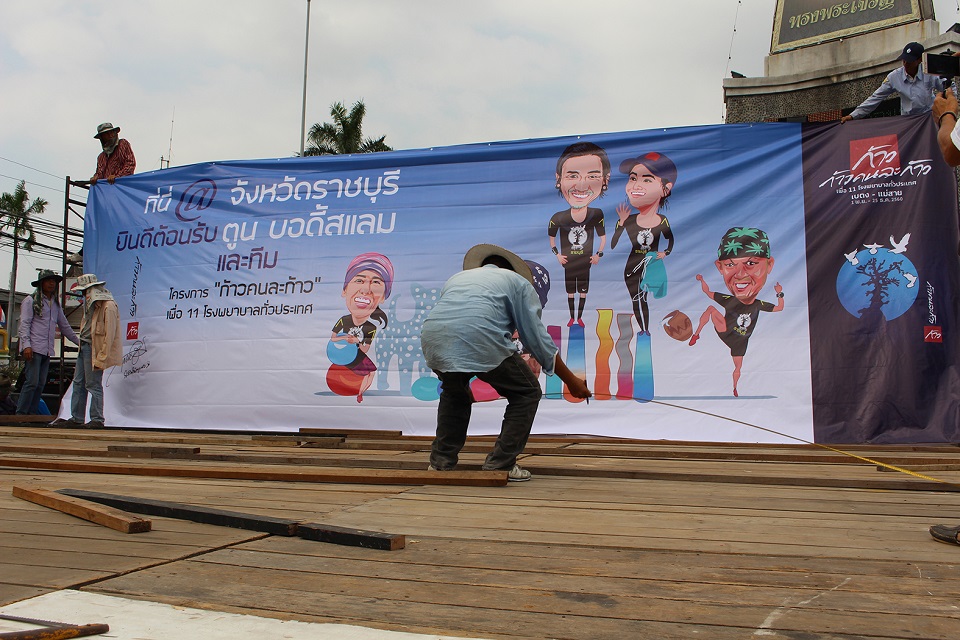 นายเอกชัย กลิ่นสุคนธ์ นายกองค์การบริหารส่วนตำบลดอนตะโก อ.เมือง จ.ราชบุรี เปิดเผยว่า ได้เตรียมกิจกรรมต้อนรับทีมวิ่งก้าวคนละก้าว เบตง-แม่สาย ไว้อย่างเต็มที่บริเวณสี่แยกดอนตะโก โดยจะมีกลองยาวมาร่วมเติมสีสันบรรยากาศให้กับนายอาทิวราห์ คงมาลัย หรือตูน บอดี้สแลม และทีมวิ่ง เพื่อให้เกิดความประทับใจ รวมทั้งพระสงฆ์จากหลายวันจะร่วมประพรมน้ำพระพุทธมนต์เพื่อเป็นสิริมงคล ซึ่งวันนี้ (1 ธ.ค.) ตูนวิ่งอยู่ในพื้นที่จังหวัดเพชรบุรี คาดว่าจะเข้าเขตราชบุรีในวันพรุ่งนี้ (2 ธ.ค.) ด้านอำเภอปากท่อ และจังหวัดได้จัดตั้งเวทีรอต้อนรับบริเวณหน้าโรงพยาบาลราชบุรี ฝั่งหน้าหอนาฬิกา