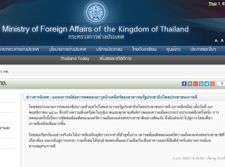 กระทรวงการต่างประเทศ ออกแถลงการณ์ ดังนี้ ไทยขอประณามการทดลองขีปนาวุธข้ามทวีปโดยสาธารณรัฐประชาธิปไตยประชาชนเกาหลี (เกาหลีเหนือ) เมื่อวันที่ 29 พฤศจิกายน 2560 ซึ่งสร้างความตึงเครียดในภูมิภาคและคุกคามสันติภาพและความมั่นคงระหว่างประเทศอีกครั้งหนึ่ง การทดลองครั้งนี้เป็นการขัดต่อข้อมติคณะมนตรีความมั่นคงแห่งสหประชาชาติอย่างชัดแจ้ง ซึ่งมีแต่จะนำไปสู่การโดดเดี่ยวเกาหลีเหนือเพิ่มมากขึ้น