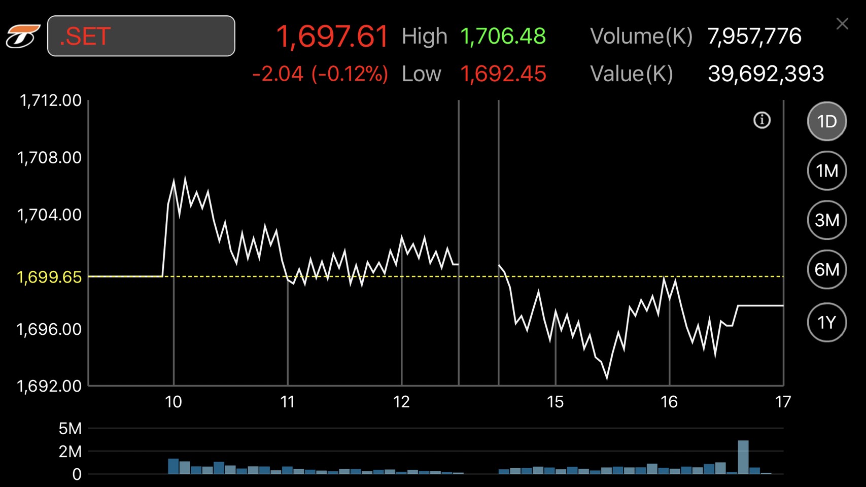 ผู้สื่อข่าวรายงานว่าดัชนีตลาดหุ้นไทยปิดการซื้อขายที่ระดับ 1,697.361 จุด ลดลง 2.04 จุด หรือร้อยละ 0.12 มูลค่าการซื้อขาย 39,692.39 ล้านบาท การเคลื่อนไหวดัชนีหุ้นไทยแกว่งตัวในช่วงแคบ ๆ สูงสุดที่ระดับ 1,706.48 จุด และต่ำสุดที่ 1,692.45 จุด โดยปริมาณการซื้อขายไม่มาก และในวันพรุ่งนี้ (5 ธ.ค.) ตลาดหลักทรัพย์ฯ หยุดทำการซื้อขาย 1 วัน เนื่องจากเป็นวันคล้ายวันเฉลิมพระชนมพรรษาของพระบาทสมเด็จพระปรมินทรมหาภูมิพลอดุลยเดช บรมนาถบพิตร