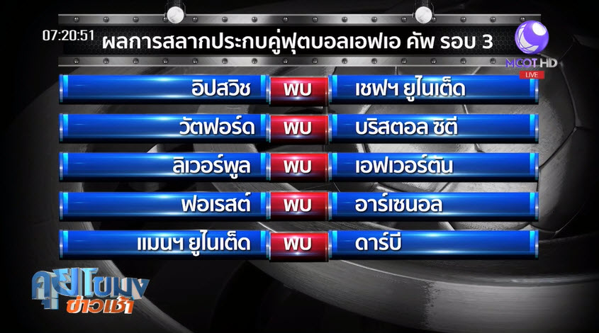 อังกฤษ 5 ธ.ค.-“หงส์แดง” ลิเวอร์พูล จะพบกับ “ทอฟฟีสีน้ำเงิน” เอฟเวอร์ตัน ส่วน “ปืนใหญ่” อาร์เซนอล แชมป์เก่า พบนอตติ้งแฮม ฟอเรสต์ ในศึกเอฟเอ คัพ อังกฤษ รอบ 3