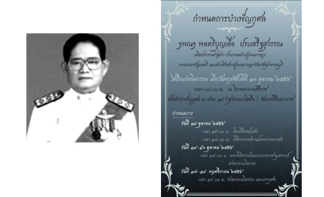 นายนิกร กล่าววว่า จะมีพิธีพระราชทานน้ำหลวงอาบศพ ในเวลา 17.00 น. วันพรุ่งนี้ (14 ต.ค.) ที่ศาลา 14 วัดเทพศิรินทราวาส และจะมีสวดพระอภิธรรมทุกวัน เวลา 19.00 น. จนถึงวันที่ 18 ต.ค. ก่อนจะมีพิธีบรรจุศพในวันเดียวกัน ซึ่งพรรคชาติไทยจะเป็นเจ้าภาพ