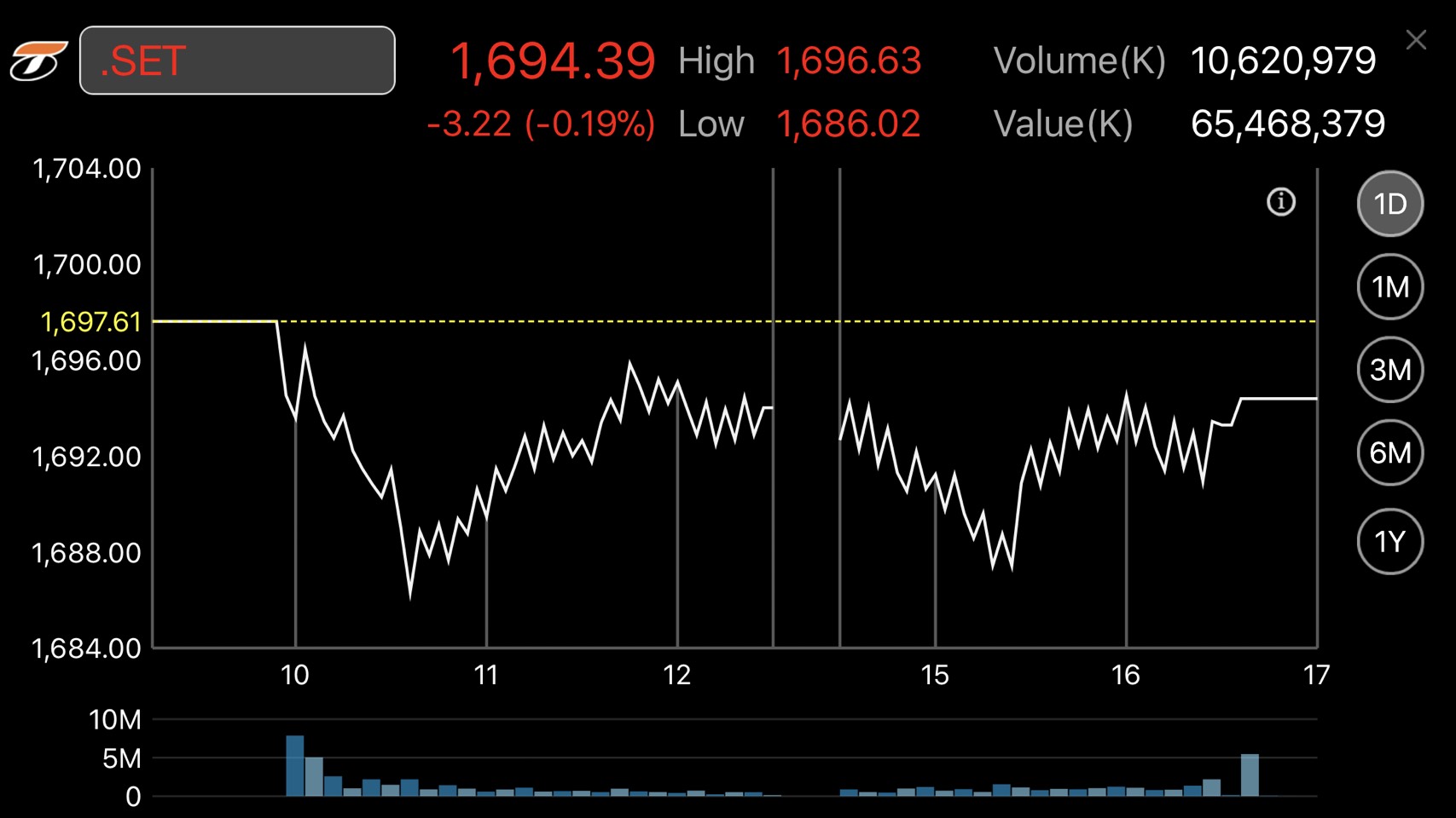 ผู้สื่อข่าวรายงานว่าดัชนีตลาดหลักทรัพย์ปิดการซื้อขายที่ระดับ 1,694.39 จุด ลดลง 3.22 จุด หรือร้อยละ 0.19 มูลค่าการซื้อขาย 65,468.38 ล้านบาท การเคลื่อนไหวของหุ้นไทยวันนี้อยู่ในแดนลบ ดัชนีต่ำสุดที่ระดับ 1,686.02 จุด และ สูงสุดของวันที่ระดับ 1,696.63 จุด
