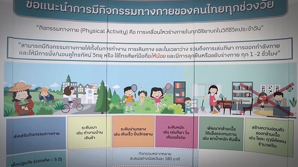 กรมอนามัย 7ธ.ค.-กรมอนามัย พบคนไทยมีพฤติกรรมเนือยนิ่ง 14 ชั่วโมงต่อวัน แนะแต่ละกลุ่มวัยมีกิจกรรมทางกาย กลุ่มเด็กปฐมวัย 0-5 ปีอย่างน้อย180 นาทีต่อวัน ,เด็กวัยเรียนวัยรุ่น 60 นาทีต่อวัน วัยผู้ใหญ่และวัยสูงอายุ 150 นาที รวมทั้งลดการใช้โทรศัพท์มือถือ หรือการดูโทรทัศน์