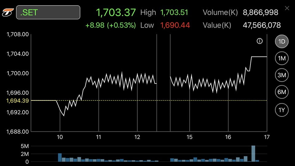 โดยดัชนีฯแตะจุดสูงสุดที่ 1,703.51 จุด และแตะจุดต่ำสุดที่ระดับ 1,690.44 จุด