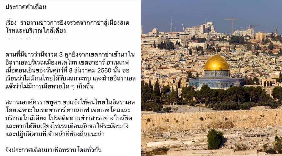 สถานเอกอัครราชทูต ณ กรุงเทลอาวีฟ โพสต์ข้อความว่า ตามที่มีรายงานข่าวว่ามีจรวด 3 ลูกยิงจากกาซ่าเข้ามาในอิสราเอลบริเวณเมืองสเดโรท เขตชาอาร์ ฮาเนเกฟ เมื่อตอนเย็นของวันศุกร์ที่ 8 ธ.ค.60 นั้น ขอเรียนว่าไม่มีคนไทยได้รับผลกระทบ และฝ่ายอิสราเอลแจ้งว่าไม่มีการเสียหายใดๆ เกิดขึ้น