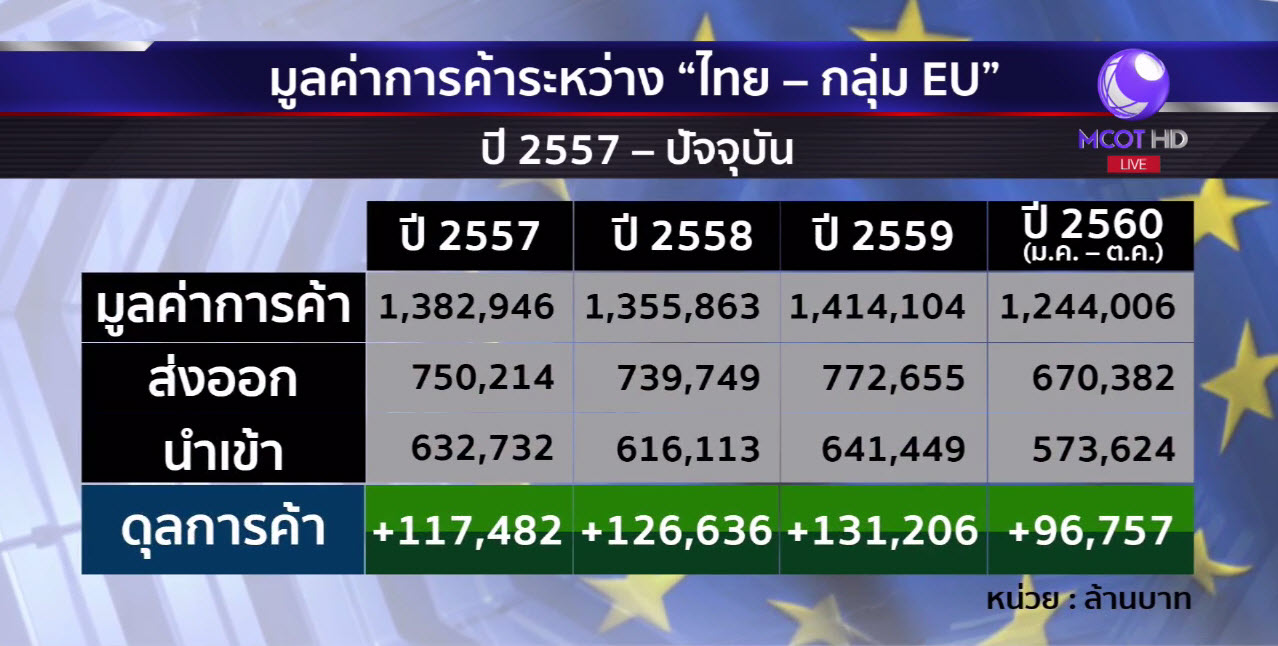 กทม. 12 ธ.ค. – ภาพรวมการค้าระหว่างไทยกับประเทศสมาชิกกลุ่มอียู 27 ประเทศ ในช่วง 10 เดือนแรกของปีนี้ หากคิดเป็นเงินบาทมีมูลค่ารวมกว่า 1.2 ล้านล้านบาท ไทยส่งออกไปอียูประมาณ 670,000 ล้านบาท และนำเข้า 573,000 ล้านบาท ซึ่งไทยเป็นฝ่ายเกินดุลการค้าอียูประมาณ 96,000 ล้านบาท และหากดูตัวเลขตลอด 4 ปีที่ผ่านมา ไทยส่งออกสินค้าไปอียูมากกว่านำเข้า ทำให้มีตัวเลขเกินดุลการค้าอียูมาตลอด โดยสินค้าส่งออกสำคัญจากไทยไปอียู เช่น เครื่องคอมพิวเตอร์และส่วนประกอบ อัญมณีและเครื่องประดับ ส่วนสินค้านำเข้าสำคัญจากอียู เช่น เครื่องจักร เครื่องบินและส่วนประกอบ และเคมีภัณฑ์