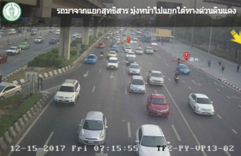 กทม. 15 ธ.ค.-สวพ.FM91 รายงานจราจรเช้าวันศุกร์ ถนนวิภาวดี-รังสิต ขาเข้า มุ่งหน้าใต้ด่วนดินแดง เคลื่อนตัวได้ช้า ท้ายสะสมปากซอยมิตรไมตรี