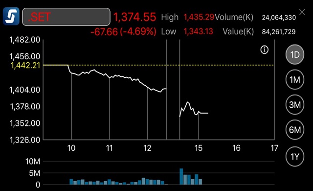 นายเจริญ เอี่ยมพัฒนธรรม อำนวยการฝ่ายวิเคราะห์หลักทรัพย์ บล.เคทีซีมีโก้ กล่าวว่า นักลงทุนตื่นตระหนกกับปัจจัยภายในประเทศ ทำให้มีแรงเทขายออกมา จนดัชนีหลุดแนวรับสำคัญและหลุดระดับต่ำสุดเดิมที่ 1,410 จุด ซึ่งการที่ตลาดหุ้นไทยปรับลงแรง มีนักลงทุนบางส่วนที่ซื้อหุ้นด้วยบัญชีมาร์จิ้น ถูกบังคับขาย (Force Sell)