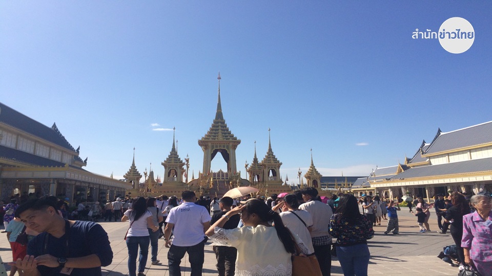 บรรยากาศโดยรอบมณฑลพิธีท้องสนามหลวง มีประชาชนจากทั่วสารทิศทยอยเดินทางเข้าชมนิทรรศการเนื่องในพระราชพิธีถวายพระเพลิงพระบรมศพพระบาทสมเด็จพระปรมินทรมหาภูมิพลอดุลยเดชอย่างต่อเนื่อง โดยทั้ง 5 จุดคัดกรองคือบริเวณศาลพระเเม่ธรณีบีบมวยผม กระทรวงกลาโหม วงเวียนรด. ท่าช้างเเละมหาวิทยาลัยธรรมศาสตร์เปิดให้ประชาชน คณะนักเรียนเเละพระภิกษุสงฆ์สามเณร เข้ามายังเต้นท์พักคอยภายในสนามหลวงได้ตั้งเเต่เวลา 05.00 น.เเละเปิดให้ชมนิทรรศการเวลา 06.30 น.สำหรับนักเรียนเเละ07.00 น. สำหรับประชาชนทั่วไป ซึ่งเเต่ละคนจะใช้เวลารอเฉลี่ย 5-10 นาทีเท่านั้น โดยช่วงเช้าที่ผ่านมามีประชาชนได้เข้าชมนิทรรศการเเล้วกว่า 10,000 คน