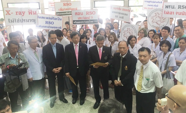 นพ.โสภณ เมฆธน ปลัดกระทรวงสาธารณสุข รับมอบหนังสือร้องเรียน ทพ.พิทักษ์ ไชยาเจริญ ประธานชมรมเครือข่ายทันตแพทย์ภาครัฐและเอกชน พร้อมกลุ่มทันตแพทย์ ที่เดินทางมากว่า 50 คน ว่า จากกรณี สำนักงานปรมาณูเพื่อสันติ ออกพ.ร.บ.นิวเคลียร์เพื่อสันติ พ.ศ. 2559 มีผล บังคับใช้ 1กุมภาพันธ์ ปี 2560 กำหนดให้ทันตแพทย์และนักรังสีต้องสอบ ความปลอดภัยทางด้านรังสีนั้น การมาร้องเรียน ไม่ใช่เรื่องของค่าธรรมเนียมที่จะกำหนดจัดเก็บ และตรวจสอบเครื่องเอ็กซ์เรย์ฟันในสถานพยาบาล หรือ คลินิกที่มากกว่า 6,000 แห่ง แต่เป็นเรื่องของศักดิ์ศรี เนื่องจากทันตแพทย์ทุกคนก่อนมาเปิดคลินิกต้องผ่านการเรียนทันตแพทย์รังสีมาก่อน ทุกคนจึงมีความรู้ความเชี่ยวชาญ แต่เมื่อพ.ร.บ.นี้กำหนดให้ต้องสอบความรู้ใหม่ จึงเหมือนวนกลับเป็นเริ่มต้นใหม่อีกครั้ง ขณะเดียวกัน การสอบย่อมมีต้นทุน ค่าใช้จ่าย ส่งผลให้ผลักภาระเพิ่มกับประชาชน ในการรับบริการ