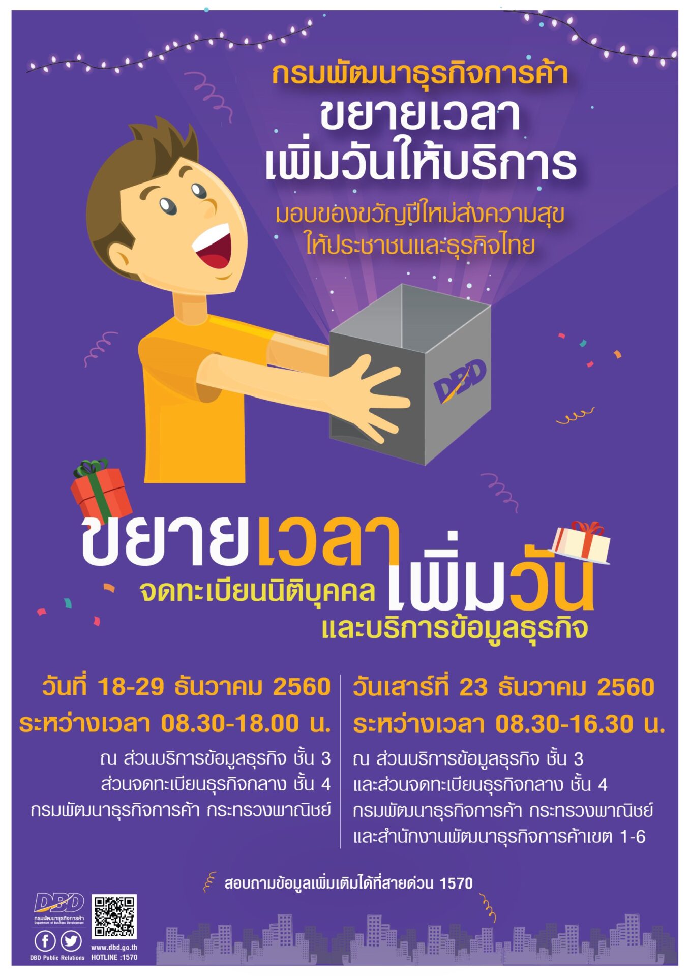 สำหรับประชาชนที่ไม่มีเวลาช่วงวันธรรมดา กรมฯ จะเปิดให้บริการพิเศษวันเสาร์ที่ 23 ธันวาคม 2560 ทั้งการให้บริการจดทะเบียนนิติบุคคลและให้บริการข้อมูลธุรกิจ ระหว่างเวลา 08.30 – 16.30 น. ณ กรมพัฒนาธุรกิจการค้า สนามบินน้ำ ชั้น 3 / ชั้น 4 และเพิ่มสถานที่ให้บริการ ณ สำนักงานพัฒนาธุรกิจการค้าเขต (สพข.) ทั้ง 6 เขต ได้แก่ – สพข. 1 ปิ่นเกล้า (อาคารธนาลงกรณ์ ทาวเวอร์) – สพข. 2 พหลโยธิน (สี่แยกประดิพัทธ์) – สพข. 3 รัชดาภิเษก (อาคารปรีชาคอมเพล็ก ซี 2) – สพข. 4 สุรวงศ์ (อาคารวรวิทย์) – สพข. 5 ศูนย์การค้าธัญญาพาร์ค ถนนศรีนครินทร์ และ สพข. 6 ศูนย์ราชการเฉลิมพระเกียรติ 80 พรรษา ถ.แจ้งวัฒนะ ประชาชนและภาคธุรกิจสอบถามรายละเอียดเพิ่มได้ที่สายด่วนกรมพัฒนาธุรกิจการค้า 1570 และ www.dbd.go.th