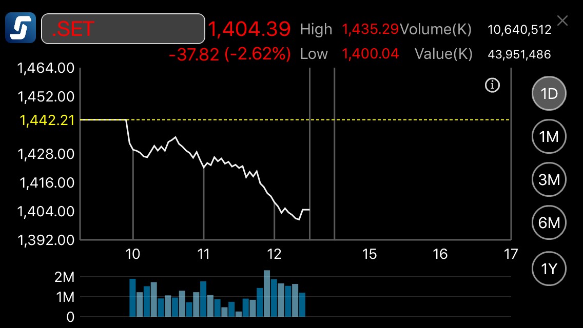 ตลาดหุ้นไทย ร่วงต่อเนื่องเป็นวันที่ 3 โดยลดลงแรงจากปัจจัยลบในประเทศยังกดดัน ประกอบกับตลาดต่างประเทศที่ปรับตัวลงตามตลาดหุ้นดาวโจนส์ ฉุดให้มีแรงขายออกมาอย่างต่อเนื่อง และลงไปต่ำสุดที่ระดับ 1,400.04 จุด