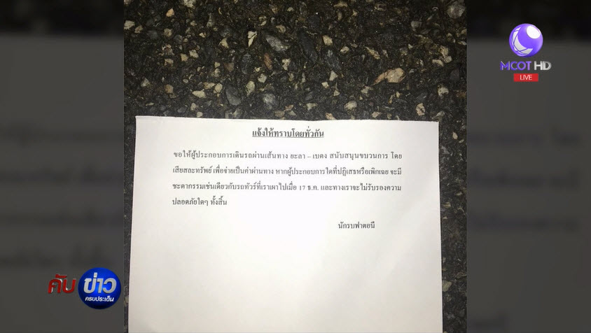 ผู้สื่อข่าวรายงานว่า เมื่อช่วงค่ำที่ผ่านมา ได้รับแจ้งจากชาวบ้านว่าได้พบใบปลิวถูกทิ้งในพื้นที่ อ.บันนังสตา จ.ยะลา หลายจุด บนถนนสาย 410 ยะลา-เบตง ซึ่งในใบปลิวดังกล่าว พบเป็นกระดาษขนาด A4 มีตัวอักษรข้อความผ่านการพิมพ์ด้วยเครื่องคอมพิวเตอร์ และคาดว่าถูกปริ้นเป็นจำนวนหลายใบ โดยระบุข้อความว่า “ขอให้ผู้ประกอบการเดินรถผ่านเส้นทาง ยะลา – เบตง สนับสนุนขบวนการ โดยเสียสละทรัพย์ เพื่อจ่ายเป็นค่าผ่านทาง หากผู้ประกอบการใดที่ปฏิเสธหรือเพิกเฉย จะมีชะตากรรมเช่นเดียวกับรถทัวร์ที่เราเผาไปเมื่อ 17 ธ.ค. และทางเราจะไม่รับรองความปลอดภัยใดๆ ทั้งสิ้น” ลงชื่อ นักรบฟาตอนี