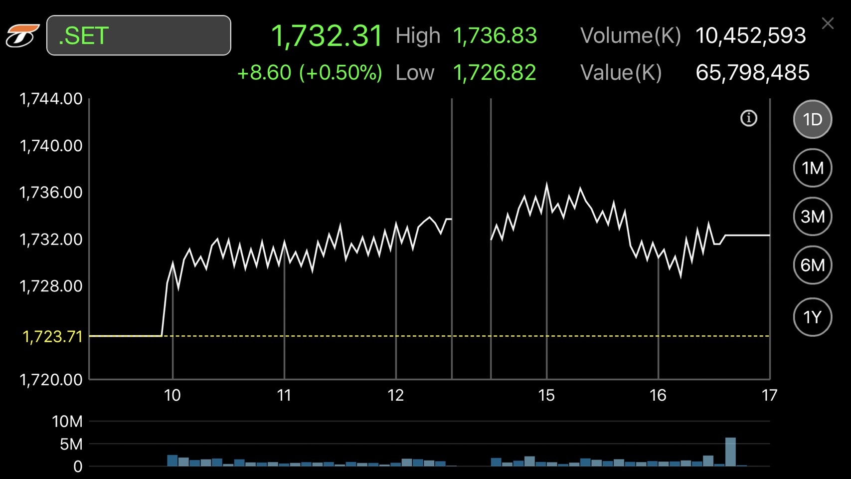 ผู้สื่อข่าวรายงานว่าดัชนีตลาดหลักทรัพย์ฯ ปิดที่ระดับ 1,732.31 จุด เพิ่มขึ้น 8.60 จุด หรือร้อยละ0.50 มูลค่าการซื้อขาย 65,798.49 ล้านบาท การซื้อขายหุ้นวันนี้ (19 ธ.ค.) ดัชนีหุ้นไทยเคลื่อนไหวแดนบวกตลอดทั้งวัน โดยดัชนีฯ แตะจุดสูงสุดที่ระดับ 1,736.83 จุด และต่ำสุดที่ระดับ 1,726.82 จุด